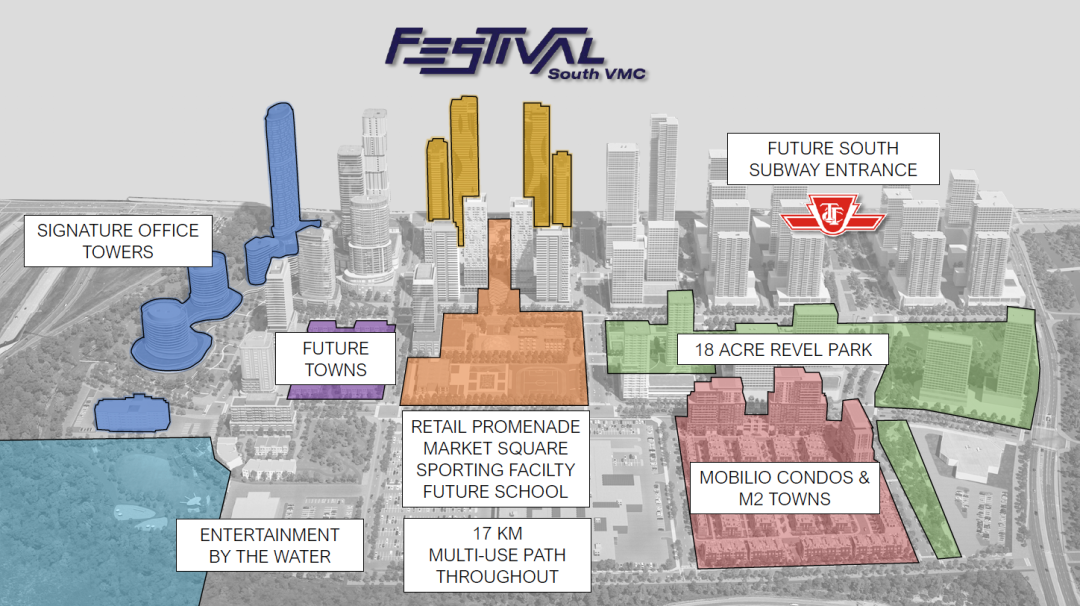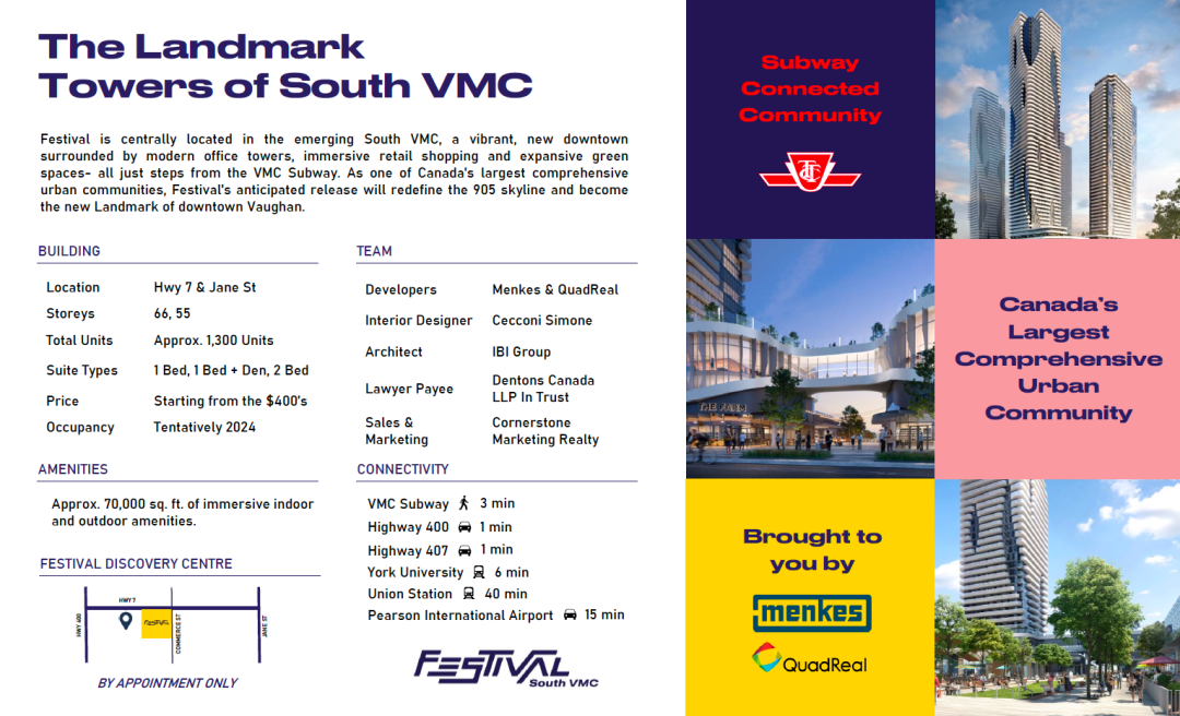 Festival就位于 VMC的TTC 地铁站附近一个交通枢纽地带,步行去VMC地铁站仅需8分钟,在这里还有VIVA,YRT和ZUM公交系统也为人们提供服务。去Richmond Hill和Brampton,Markham等周边地区都十分便捷!