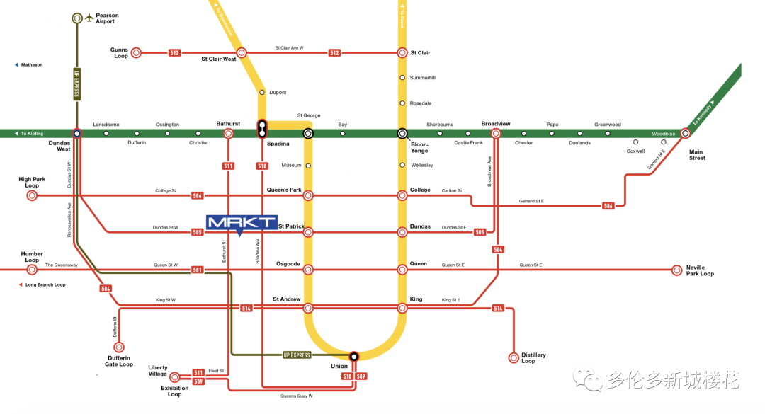 Mrkt Condos坐落在Queen Street West,Kensington Market和唐人街的中心位,举步之遥到达各种热门商店、餐厅、博物艺术馆和学校;多伦多大学,OCAD,瑞尔森大学,AGO艺术馆,各种奶茶店,电影院,电玩城,获奖餐厅,Mrkt Condos地址的便利程度无可比拟。南北和东西都有24小时公共汽车,出行十分方便。而著名的皇后街不仅是多伦多休闲、娱乐、酒吧、文化、艺术、时装、购物等中心;更是通往多伦多金融区、高级办公区和多伦多市政府的要道。Spadina大道更是一条商业街,中国城Chinatown就在这里,各种各样的商铺和餐馆不计其数。MRKT at Alexandra Park Condo 所位于的Queen West街区,现也越来越被国际上承认其艺术,文化上的地位。 南北和东西向都有24小时公车服务 步行2分钟可至唐人街、公园、酒吧 5分钟可至影剧院、地铁站、金融区与高速公路 10分钟可达多大、市政府与医院,实为学习工作安居共存的好社区