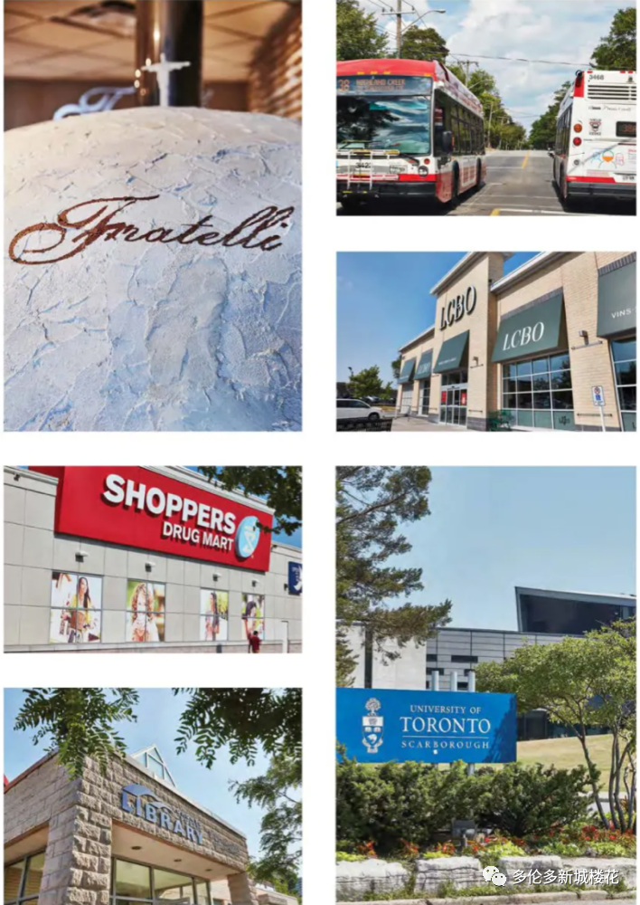 便捷的地理位置: - 开车5分钟可达多伦多大学世嘉堡分校 - 开车5分钟可达百年理工大学Morning Side校区 - 开车10分钟可达百年理工大学Progress校区 - 6分钟可达Hwy 401 - 6分钟可达Rouge Hill Go - 7分钟可达Guildwood Go - 举步TTC车站可通达UTSC和百年理工 - 15分钟达Scarborough Town Centre购物中心 -数分钟车程可到多伦多动物园 - 附近公园林立,如Highland Creek,Morning Side Park,Colonel Danforth Park等。 -周边百货商铺名校环绕,环境优美,却闹中取静。公寓周边基础设施丰富,60多家商铺环绕,包括各大银行、药店、咖啡店以及Food Basic和No Frills等超市。 03