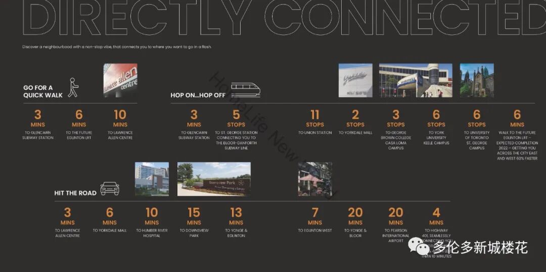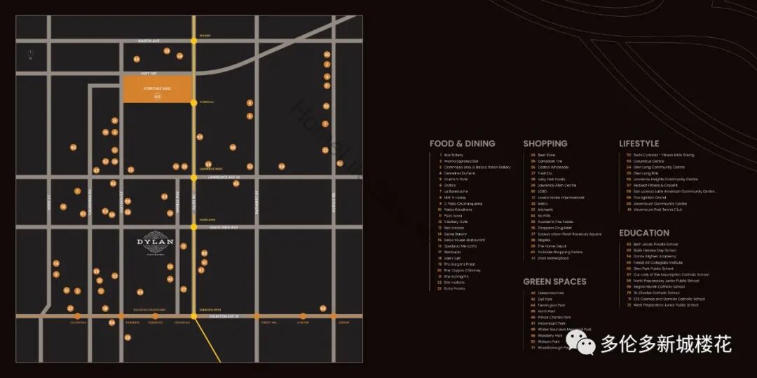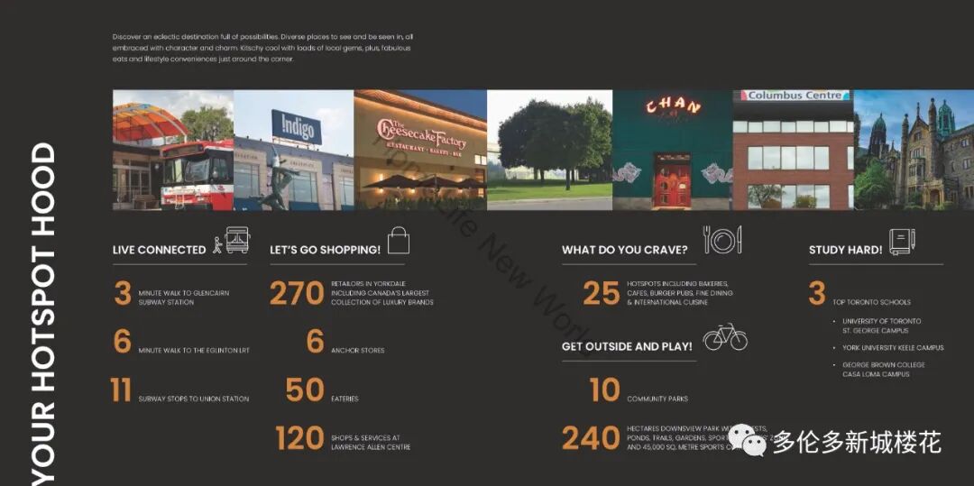 项目名称:Dylan Condos 楼盘地址:831 Glencairn Avenue, Toronto, ON 交界处:Glencairn Ave&Marlee Ave 楼盘开发:Chestnut Hill Developments 楼层高度:10 层 单位数量:218 面积:505 sq ft ~1305 sq ft 交房时间:2024年3月 The Dylan Condos是由著名开发商Chestnut Hill Developments在北约克核心地带开发的精品楼盘。地理位置得天独厚,位于Glencairn Ave&Marlee Ave交叉路口。The Dylan项目距离Glencairn TTC地铁站,Yorkdale购物中心,York大学以及许多商业园区和办公大楼只有数分钟的路程,是年轻专业人士,学生和家庭的理想之选。 优越地理位置