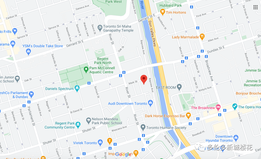 位处沿Don River西岸,介于Queen Street E和Dundas Street E之间的Defries Street的河景房和湖景房。