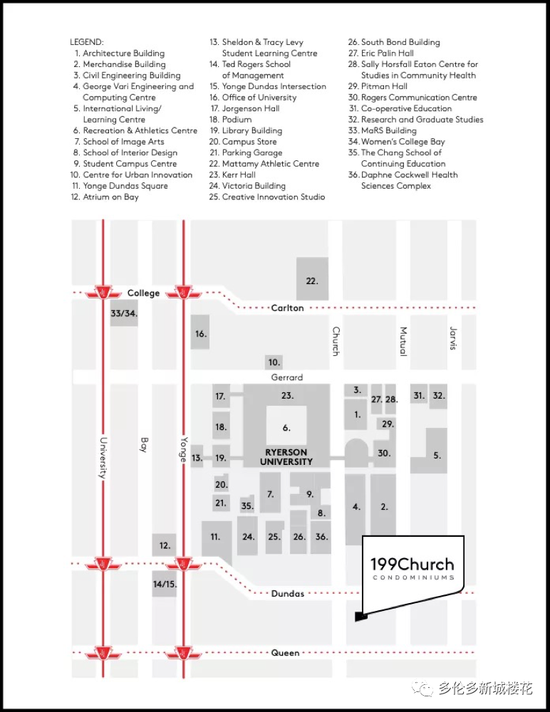 【楼盘名称】199 Church Condominiums 【地理位置】199 Church St (Church / Dundas E) 【开 发 商 】CentreCourt 【交楼日期】2023年底 【 总 栋 数 】1栋 【 总 层 数 】37层 【 总 户 数 】478户 199 Church Condo地处繁华,作为步行者的天堂, 交通枢纽, 拥有97/100近满分的步行指数和满分的交通指数, 实属世界顶级交通网!比邻多伦多最大商场Eaton Centre, 金融区,四大名校,Bloor 一线名牌街,350米地铁+街车贯通,100米到Ryerson大学,亦是多伦多最具人气的地区! 毗邻 ‘多伦多时代广场Eaton’ 璀璨金融区,四大名校,Bloor一线名牌街,唐人街,多伦多电影节主会场,多伦多市政厅,直接繁荣,又有地铁/街车贯通,可以说是回报率最好的地段,也是多伦多人气地区之一。199 Church Condo 是您最好的选择!Ryerson University,OCAD University,George Brown College,University of Toronto,四所名校 均可在8分钟内到达!199 Church公寓楼盘更毗邻PATH地下商城入口。 限时优惠:(首付仅需15%) 本地居民:签约付$10,000;30天付5%;120天付5%;570天付5% 非本地居民:签约付$10,000;30天付10%;370天付5% 车位:$95,000 (665尺以上单位可购买) 储物间:等候名单 管理费:$0.69/sqft (包暖) **免费转让(原价$5,000)** 赠送2年包租服务(3房823 sqft -$4300/month;860s qft - $4400/month) 2房732 sqft -$3700/month 02