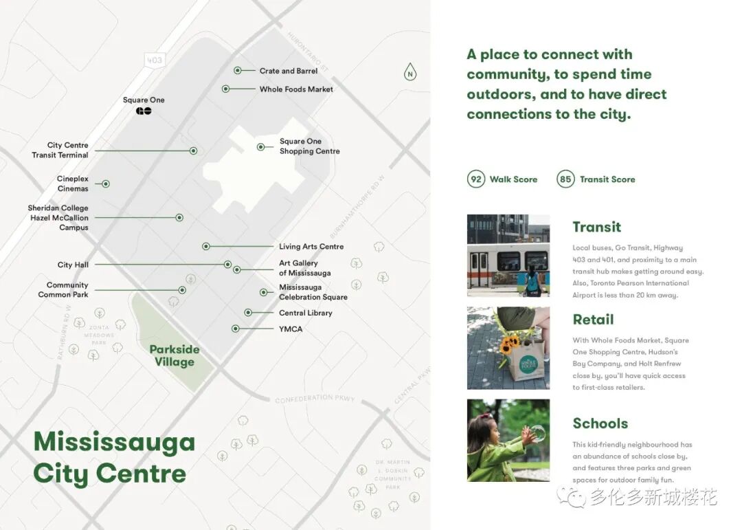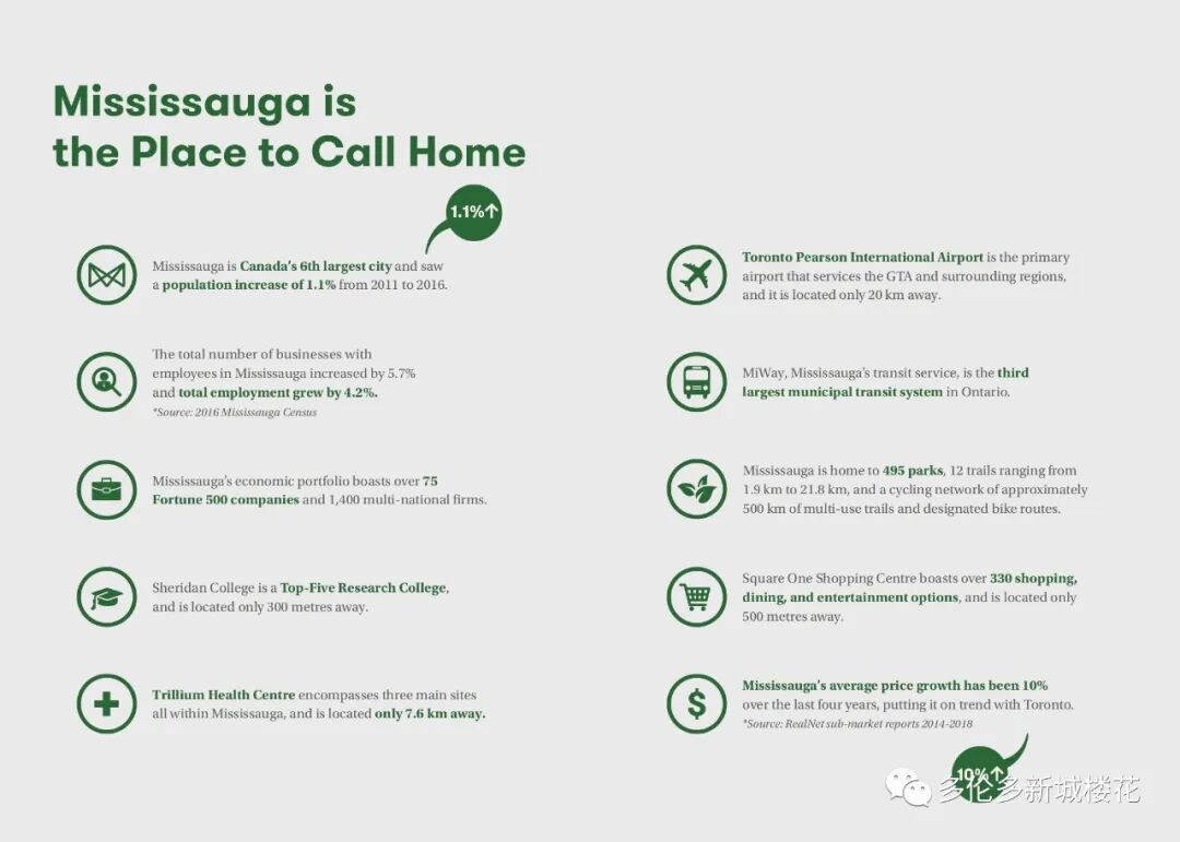 密西沙加市(Missisauga)以人口计算是全国第六大城市。这里近机场,交通便利,有很多公司,全球最大五百家公司里有大约50个公司总部就设在这里,是整个安省仅次于多伦多市中心的第二大就业中心,位于多伦多以西的皮尔区,是大多伦多地区的一部分,地铁和公车系统跟多伦多都有很紧密的衔接,公共交通非常方便。早在2017年密西沙加的企业就多达90,780家,就业人员达438,168人,就业率为0.57,即本地的企业可以为每100位本地居民提供57个本地的就业机会。而这些企业中有1300余家为跨国公司,其中就包括世界500强公司中的75家。微软、惠普、亚马逊等都把加拿大的总部设在了密西沙加。此外,密西沙加还是北美排名第三的FIRE (Finance, Insurance, Real Estate) Cluster( 亦称为“金融、保险和地产集群”)。 这里有多伦多大学密西沙加分校(UTM),Sheridan college , 每年留学生涌入,导致square one附近房屋空置率极低,2019年空置率不到1%。 开发商介绍