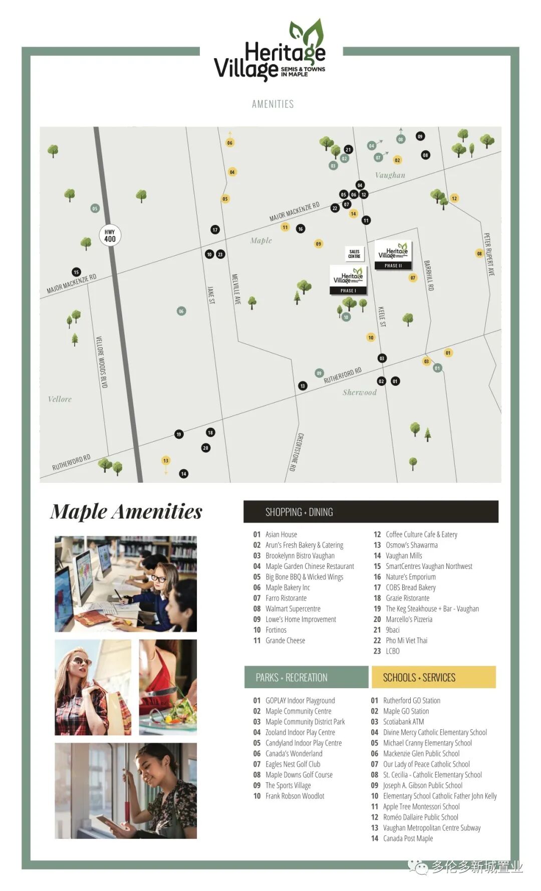 项目名称:Heritage Village 项目交界处:Keele St. & Cromwell Rd(9560 Keele Street) 项目外观:三层 开发商:Laurier Homes 项目大小:1474-1716平方英尺 管理费:$185.18/月 入住时间:2022年底 Heritage Village Towns 位于黄金路口Keele St. & Cromwell Rd西北角。旺市高品质社区,历史悠久的Maple社区,现如今已是旺市茁壮成长的商业区之一,安省最大的游乐园Wonderland/Vaughan Mills著名商业购物中心所在地。因其靠近当地成熟通勤设施和高速公路而倍受青睐,400/Hwy 7/407/GO Transit/旺市市中心地铁/VMC。不仅如此,Maple社区仍然保留着标志性的遗产特征。在这里,生态公园,高级高尔夫俱乐部,园林景观,古树奇石围绕四周。居城市不远,与自然邂逅,推开窗负氧离子便扑鼻而来。 地理位置