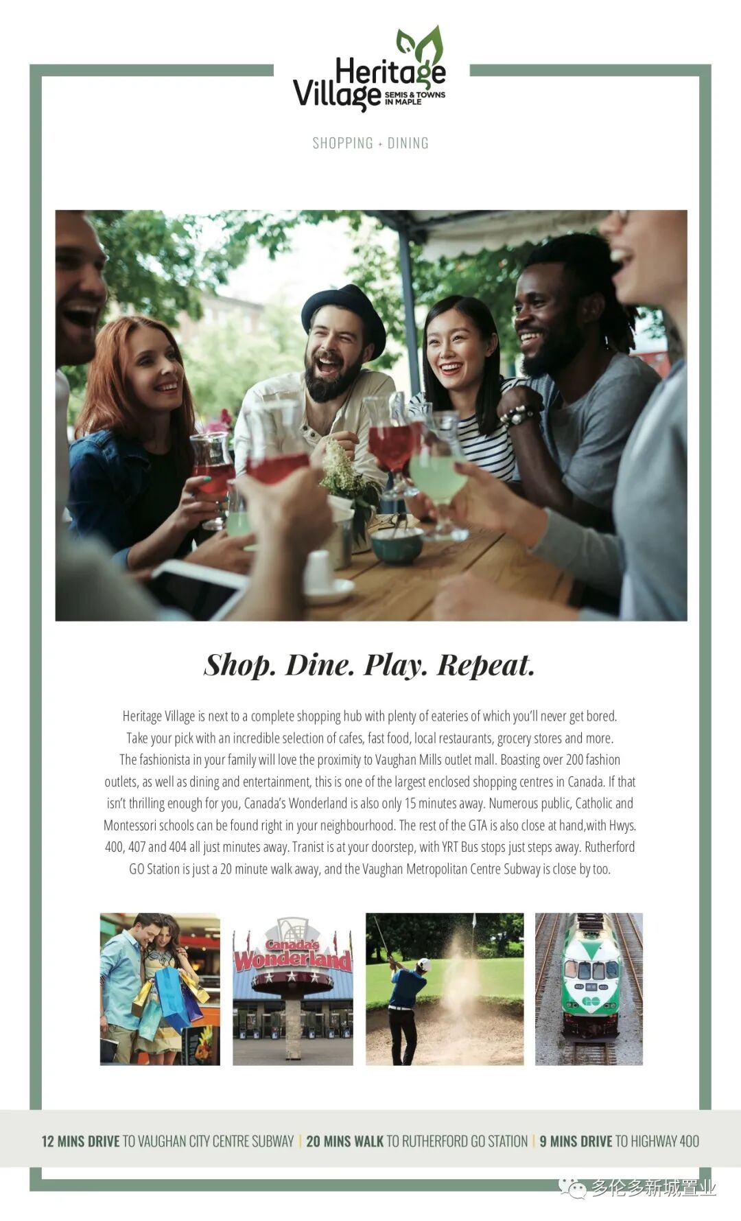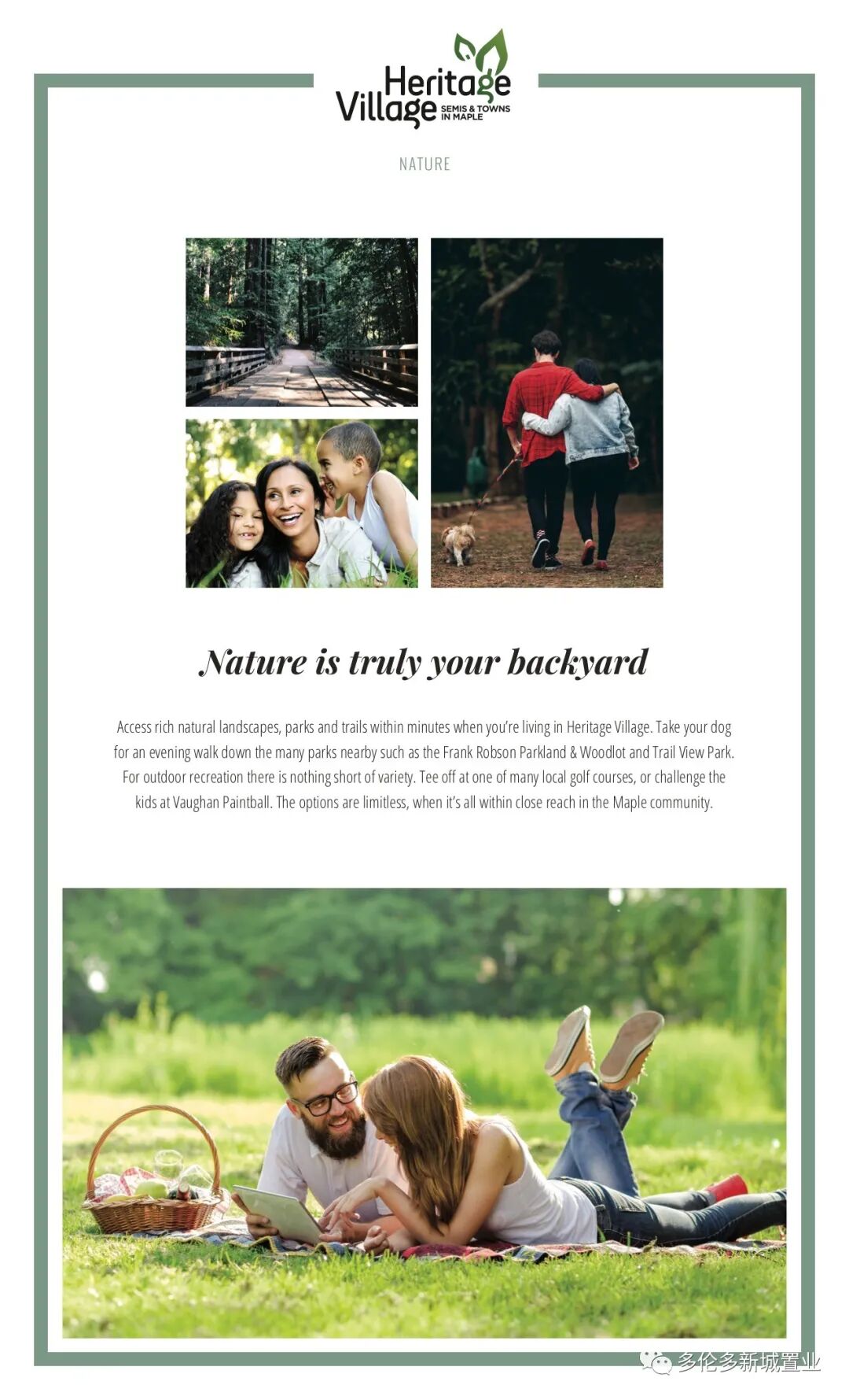 HERITAGE VILLAGE有适合任何年龄的孩子的教育机构。无论孩子是需要入幼稚园,小学还是中学,该地区都有公校和天主教学校可供选择。附近还有MAPLE LIBRARY公共图书馆可以借阅图书,仅需步行四分钟即可抵达。 DIVINE MERCY CATHOLIC ELEMENTARY SCHOOL MICHAEL CRANNY ELEMENTARY SCHOOL MACKENZIE GLEN PUBLIC SCHOOL OUR LADY OF PEACE CATHOLIC SCHOOL ST. CECILIA - CATHOLIC ELEMENTARY SCHOOL Heritage Village Laurier Homes新建的联排别墅和半独立式开发项目。经典的全砖建筑,开放式概念设计和大窗户结合了经典与现代的精华,可为您提供居家所需的一切。风格与灵活空间的无缝结合使Heritage Village与众不同。安静舒适,风景宜人,蓝调生活,宜居宜租。家庭精装实用三居单车库布局,高端联排及半独立屋任君挑选,建设两出停车位,精工细作,非凡之作。开发商以扩展起居空间为核心设计理念,并融合传统古典风情,布局考究,轻奢视感,休息区小而精,活动区大而简。无论是单身贵族、二人世界、三口之家、四人家庭,以及更大的家庭SIZE,Heritage Village 都可以为您找到最心仪的居家住宅。 开发商