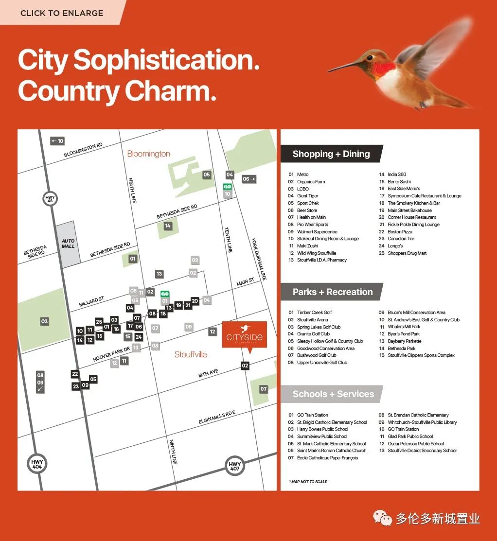 Cityside Homes豪华独立屋楼花项目,位于Whitchurch-Stouffville,近 Tenth Line和19th Avenue的交界处,2022年底至2023年初开始入住。 【楼盘名称】Cityside Stouffville 【楼盘位置】Tenth Line, Whitchurch-Stouffville 【车位】双车库 【层数】两层 【价格】120余万起 【开发商】Fieldgate Homes 【户型】36’ Singles, 40’ Singles Cityside Stouffville位于Stouffville南部,地理位置优越,市区以Main Street(York Regional Road 14)、Mill Street和Market Street的交汇处为中心。距离万锦市不25分钟车程,40分钟可达多伦多市中心。16分钟即可上404高速,离Stouffville GO Station 也只需4分钟。距离多伦多皮尔逊国际机场东北55公里。 Cityside是一个乡村魅力和城市便利和谐并存的独特社区。在这里,你既可以享受周边绿地的美丽,又能便利到达一系列精品商店、餐厅和城市基本设施。当你把Cityside称为家时,一切都近在咫尺。社区被安静的街道围绕,也可以在附近的多个公园和高尔夫球场内休闲娱乐,是适合家庭居住的完美住宅。 关于Stouffville: Whitchurch-Stouffville 位于多伦多北部,是约克郡的重镇,被誉为安省的“桃花源”。该城市拥有广阔的农牧区、茂密的森林、湖泊、峡谷、马术场、世纪农场、房屋、高尔夫球场, 濒临闹市却又远离喧嚣,所以有“桃花源”的美称。 现住的居民大多以本地白人为主,占到了81%,外来移民约占19%,这样的配比很适合外来移民迅速了解、融入当地生活。这里交通便利,南边有407和HWY 7,西边是404,还有48号高速;到多伦多Downtown有goTrain,Stouffville Gotrain 站和 Lincolnville Gotrain站可送你每天到多伦多市中心上班。这里生活也便利,大型Plaza很多,各种品牌的生活配套设施都很齐全。在HWY7夹McCowan有个华人喜欢的丰泰超市和Markville Mall,从此处沿McCowan大路北上,都不用上高速,仅开出不到10公里就进入Whitchurch-Stouffville。这里教育资源也很丰富,有英法双语教育,学校排名稳中有升,每年都在进步。 开发商介绍: Fieldgate Homes是一家有60年历史的知名开发商,以在独特的街区建造独特的住宅而闻名,他们开发的这些住宅兼具投资性和艺术性,多年来深得业主和专业人士的认可和赞扬。 付款方式: 36' Singles:签约付4万,30天付4万,60天付4万,90天付4万,120天付4万(共20万) 40' Singles:签约付4万,30天付4万,60天付4万,90天付5万,120天付5万(共22万) 交房时间:2022年底至2023年初开始入住