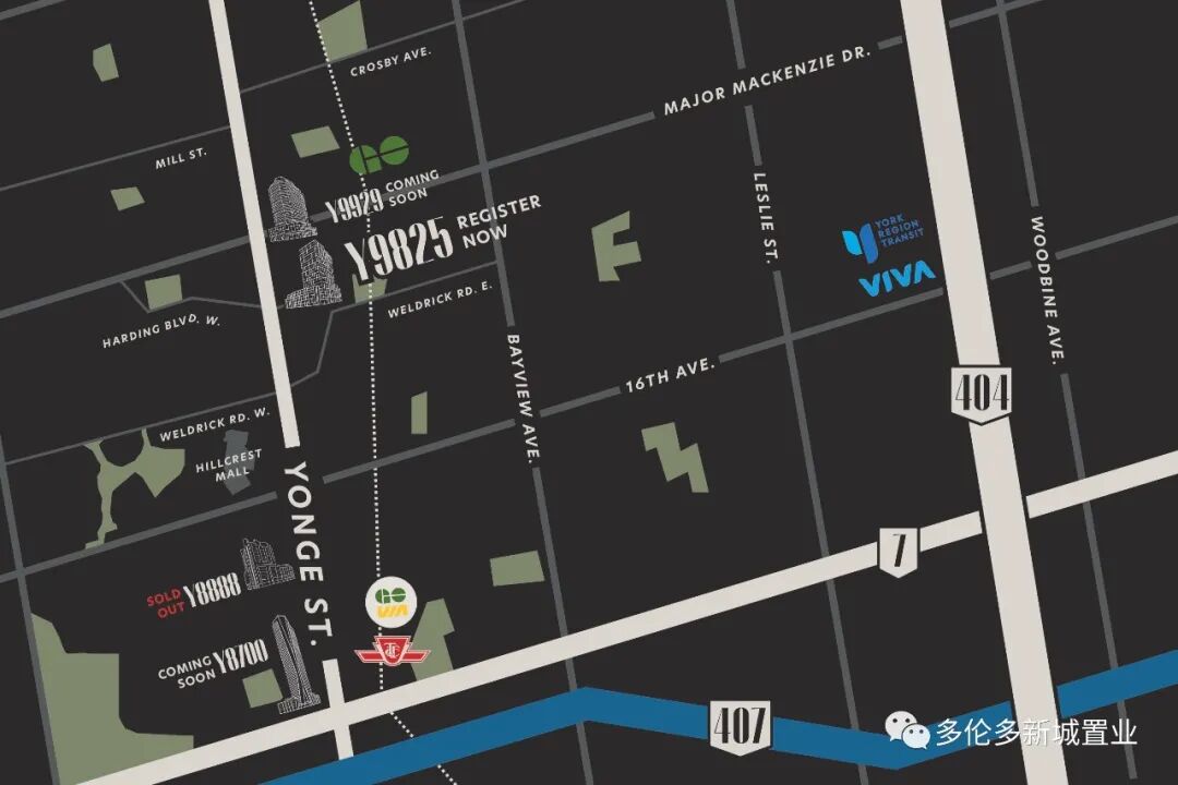 项目名称:Y9825 地址:9825 Yonge St Richmond Hill ON 建筑类型:Condominium-1~3卧室&镇屋 楼层:22层 总单元数:451套 价格:40余万起 开发商:Metroview Developments 交房时间:2025年秋 Y9825 Condos项目位于列治文山市中心的Harding社区,紧邻多伦多南北龙脉Yonge St.,位于Yonge St & Harding Blvd W的交汇处,坐落于大多伦多地区交通最为繁忙、贯穿南北的Yonge Street地铁延长线上。Y9825 Condos 公寓门前公交线路直接连接Langstaff GO 火车站,开车可快速进入404和407高速公路。Yonge街地铁延长线未来也将在此设立站点,未来的列治文山中央车站将成为Hwy7 / Yonge St 以北居民的重要枢纽中心,这里是列治文山最炙手可热的黄金区域。 紧邻Yonge Street,楼下就是车站直达Go Stations 开车3分钟到Richmond Hill Go Station 快速到达高速404及407 开车10分钟到Lanstaff Go Station 附近有Red Maple小学和Lanstaff中学 交通便利,快捷餐馆,咖啡馆,Hillcrest商场,电影院 步行就可到达大统华超市及各类餐馆等 举步未来地铁延长线入口 教育资源优质,毗邻Red Maple小学和Lanstaff中学 举步可到达大统华超市及各类中餐馆西餐馆等 附近公园包括Huntington Park, Bayview Reservoir Park, Cakebread Park等 区域内拥有一流的高尔夫俱乐部,附近的Uplands Glof Club冬天还能滑雪。 Walmart super centre,best buy, golf club, silvercity, 一站式生活就在家门口!