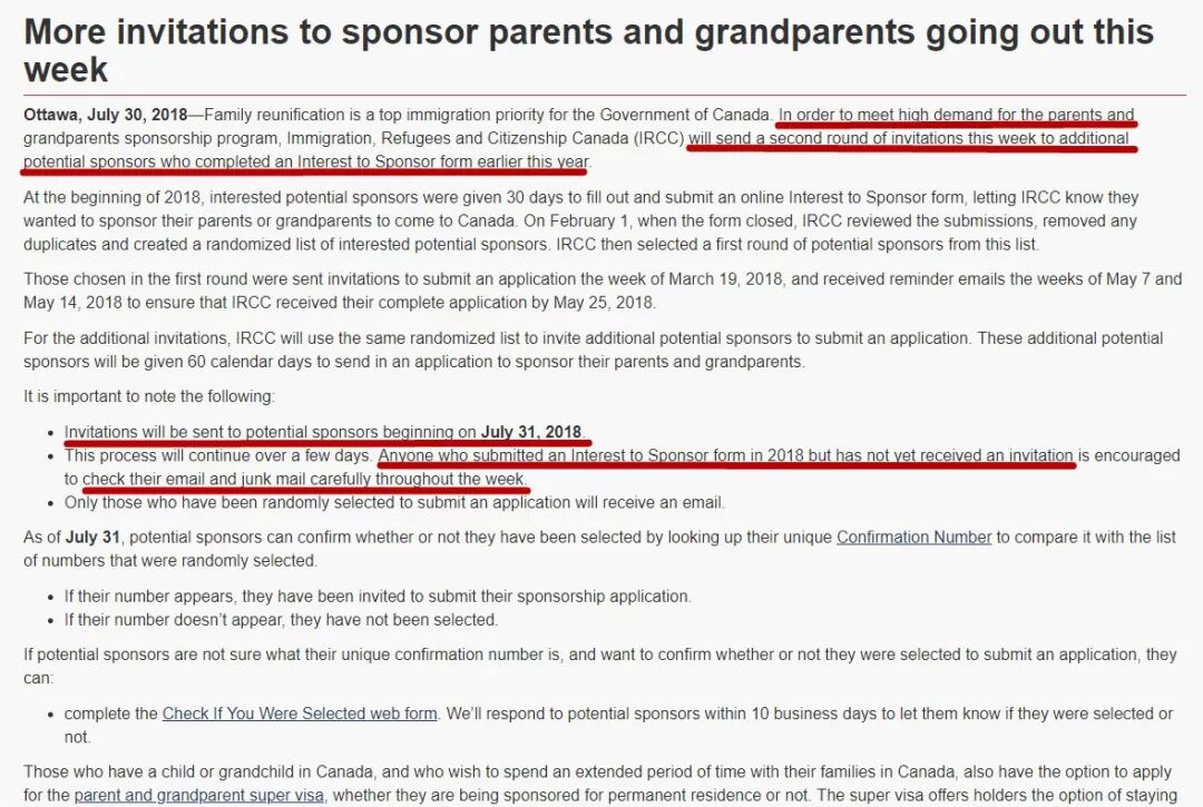 2018年的父母/祖父母团聚移民在2018年1月2日正式开放,延续了2017年的抽签制度,担保人在2018年1月2日至2018年2月1日之间需提交意向担保表格(Interest to Sponsor Form)。而继今年第一次抽签一万名后,又补抽了7000.