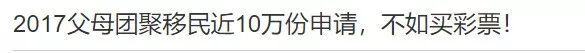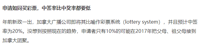 新政策出台后,加拿大广播公司将其比喻作彩票系统(Lottery System),在每年接近十万的申请中,仅仅给一万个名额,预计中签率只有10%左右。目前担保父母移民变成了运气项目,众说纷坛,许多网友媒体给出负面评价,认为10年都抽不中的现象也一定存在。父母和祖父母的年龄已经不小,还能等几个十年?